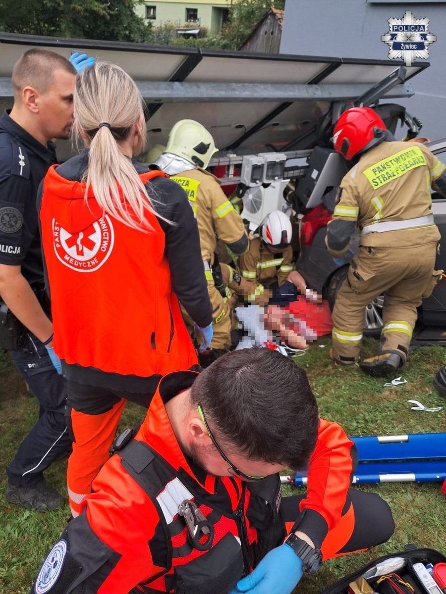 Dzięki błyskawicznej interwencji straży pożarnej, policji i ratowników medycznych 66-latek został wydobyty przy użyciu narzędzi hydraulicznych. Poszkodowany był przytomny i kontaktowy przez cały czas akcji. Po wstępnym badaniu przez Zespół Ratownictwa Medycznego trafił do Szpitala w Żywcu na dalsze badania. Ponieważ jego życie nie było bezpośrednio zagrożone, odwołano śmigłowiec Lotniczego Pogotowia Ratunkowego.