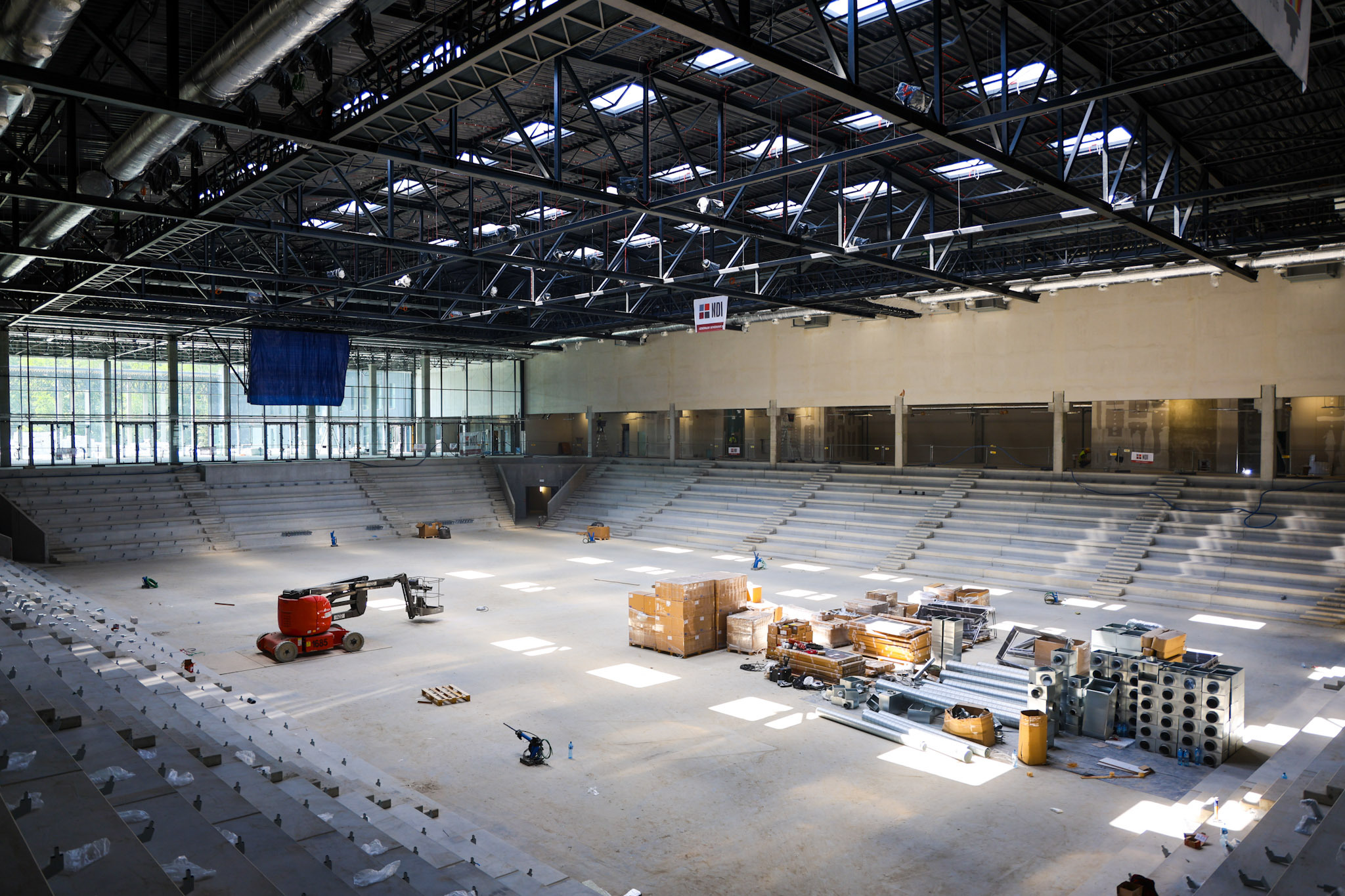 Postępy prac widoczne są także w przypadku hali. W budynku trwają zaawansowane prace wykończeniowe, montaż suchej zabudowy, prace tynkarskie oraz malarskie. Trwa wyposażanie pomieszczeń sanitarnych w instalacje podtynkowe, kotłowni, wyposażanie układu hydroforowego, pożarowego oraz prowadzone są próby ciśnieniowe na wykonanych instalacjach. Zakończono już montaż układu wentylacji hali widowiskowo-sportowej. Wykonano także fasady szklane dla sky boxów, pomieszczeń obsługi widowiska sportowego i holu wejściowego hali. Realizowane są prace z branży elektrycznej i teletechnicznej.