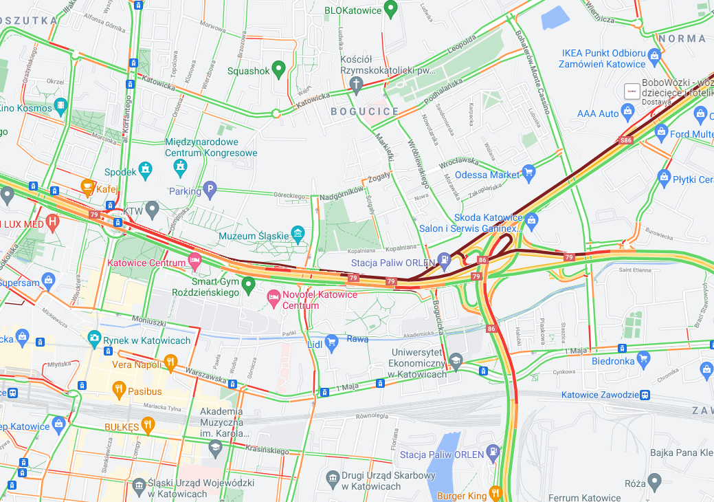 Korkuje się od strony Sosnowca (S86) oraz od (DK 79) w kierunku centrum miasta.