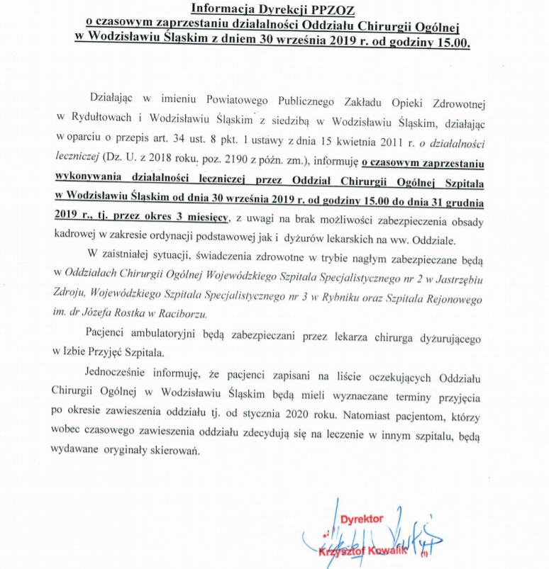 Szpital powiatowym w Wodzisławiu Śląskim zawiesza oddział chirurgi ogólnej. Nie będzie funkcjonował przez kolejne 3 miesiące.