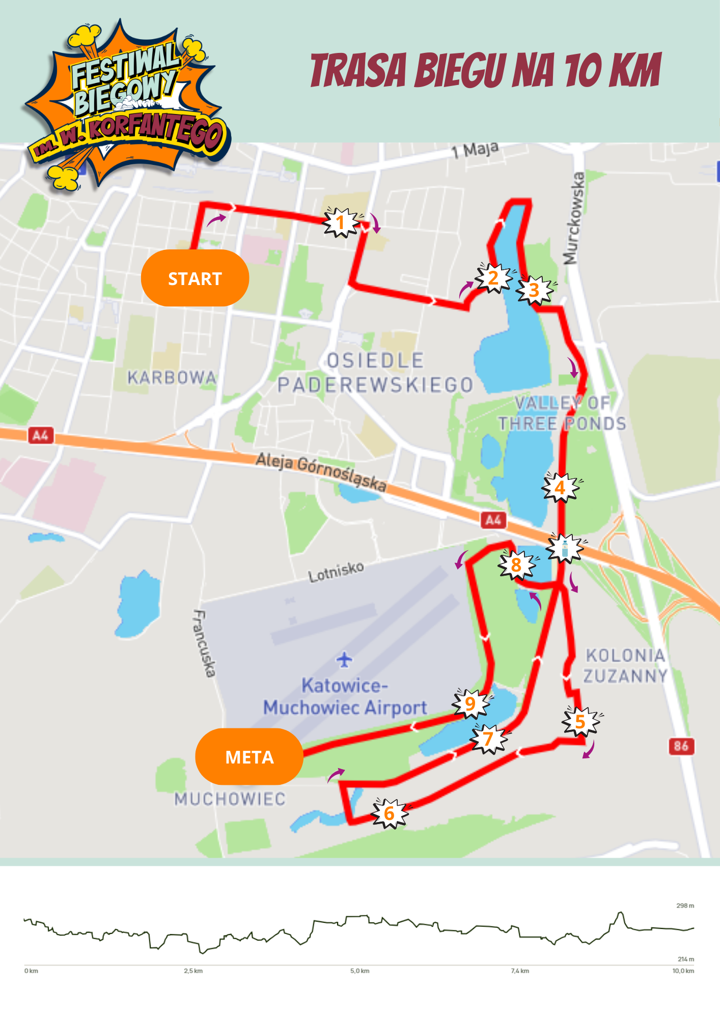 Festiwal odbędzie się 14 kwietnia. O godzinie 13.00 biegacze ruszą z Placu Sejmu Śląskiego, na którym znajduje się pomnik Wojciecha Korfantego. Stamtąd ulicami: Lompy, Krasińskiego, Graniczną i Sikorskiego dobiegną do Doliny Trzech Stawów, której alejkami prowadzi większość trasy, by po przebiegnięciu łącznie 10 km przekroczyć linię mety na Muchowcu. Tutaj też odbędą się biegi dla dzieci i młodzieży, które rozpoczną się o godz. 14.00. Biegi te odbędą się na dystansach: 50 (dla dzieci do lat 6), 100 (7 i 8 lat), 200 (9 i 10 lat), 400 (11 i 12 lat) i 600 metrów (13-15 lat) w kategoriach zarówno dziewcząt jak i chłopców.