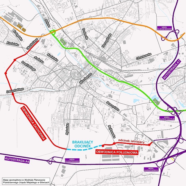 Przypomnijmy, że zbudowane zostały już wszystkie pozostałe części trasy: z jednej strony – od ul. Pszczyńskiej (od węzła autostradowego Gliwice Sośnica) do ul. Bojkowskiej, z drugiej – od al. Jana Nowaka-Jeziorańskiego (DK 88) do ul. Sowińskiego, od ul. Sowińskiego do ul. Daszyńskiego i dalej do ul. Rybnickiej.