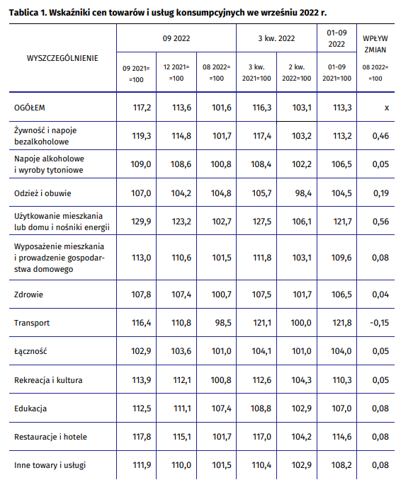 Z danych GUS wynika, że inflacja w porównaniu z wrześniem 2021 osiągnęła rekordowe 17,2%. Najbardziej dotknęła ona ceny żywności, ceny utrzymania mieszania oraz koszty energii. Żywność podrożała o 19,3%, napoje alkoholowe i wyroby tytoniowe o 9%, restauracje i hotele o 17,8%, wyposażenie mieszkania i sprawdzenie gospodarstwa domowego o 13%, transport o 16,4%, największy wzrost zanotowano w użytkowaniu mieszkań i nośnikach energii - tutaj rekordowe 29,9%. Z artykułów spożywczych najbardziej podrożał cukier, z opłat mieszkaniowych gaz i opał.