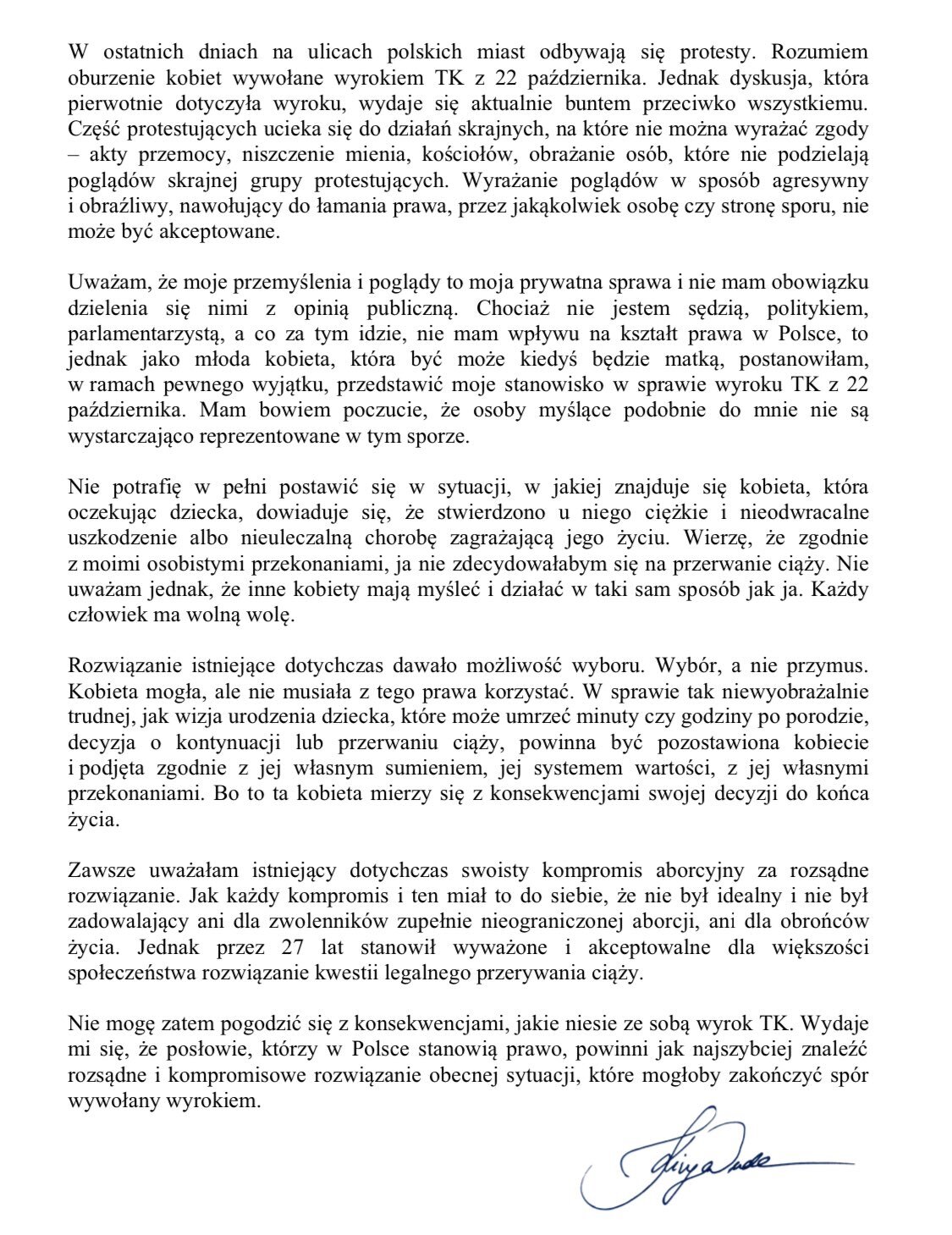 Pismo w sprawie aktualnych wydarzeń w Polsce Kinga Duda zamieściła na Twitterze. Na początku swoistego listu córka prezydenta informuje, że rozumie oburzenie kobiet, które wywołał wyrok TK. Jednak sprzeciwia się agresywnym protestom, które nie dotyczą już samego wyroku.