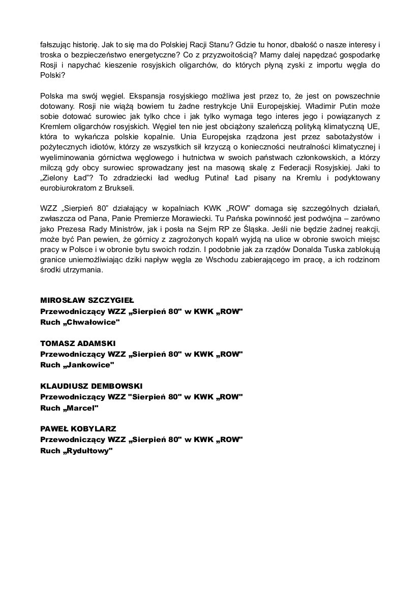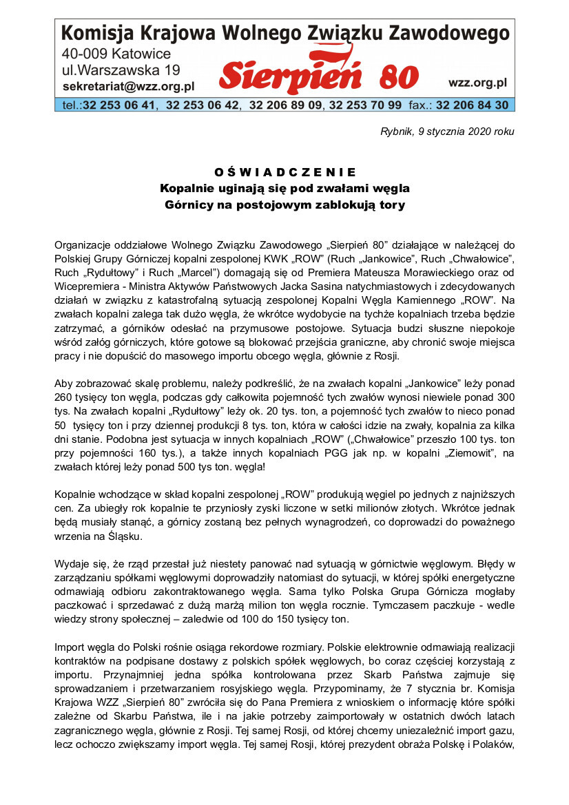 W liście czytamy: Organizacje oddziałowe Wolnego Związku Zawodowego „Sierpień 80” działające w należącej do Polskiej Grupy Górniczej kopalni zespolonej KWK „ROW” (Ruch „Jankowice”, Ruch „Chwałowice”, Ruch „Rydułtowy” i Ruch „Marcel”) domagają się od Premiera Mateusza Morawieckiego oraz od Wicepremiera - Ministra Aktywów Państwowych Jacka Sasina natychmiastowych i zdecydowanych działań w związku z katastrofalną sytuacją zespolonej Kopalni Węgla Kamiennego „ROW”. Na zwałach kopalni zalega tak dużo węgla, że wkrótce wydobycie na tychże kopalniach trzeba będzie zatrzymać, a górników odesłać na przymusowe postojowe. Sytuacja budzi słuszne niepokoje wśród załóg górniczych, które gotowe są blokować przejścia graniczne, aby chronić swoje miejsca pracy i nie dopuścić do masowego importu obcego węgla, głównie z Rosji - pisze WZZ "Sierpień 80".