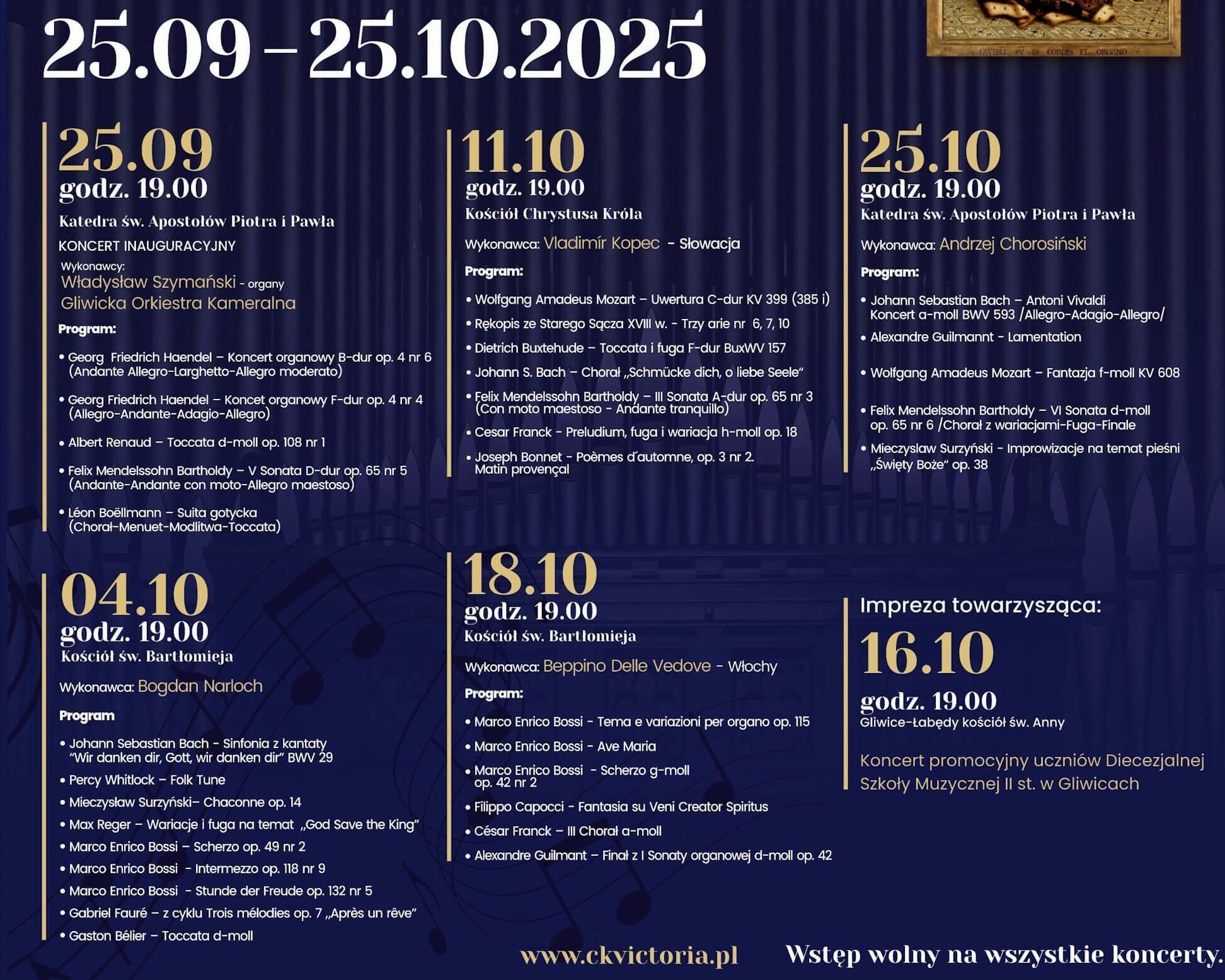 Koncerty odbędą się w wyjątkowych wnętrzach gliwickich świątyń, w tym w katedrze pw. św. Apostołów Piotra i Pawła, kościele św. Bartłomieja oraz w Łabędach, co dodatkowo wzbogaci muzyczne doświadczenie uczestników.