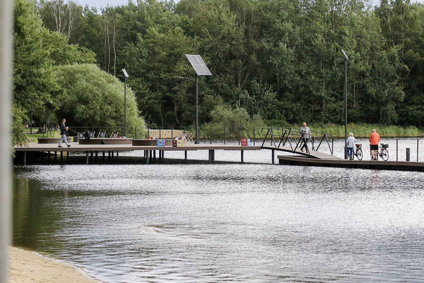 W ramach prac zagospodarowano i uporządkowano teren wokół stawu. Mieszkańcy mogą korzystać ze znajdującej się tu plaży, a także z pomostu – częściowo stałego, a częściowo pływającego. Na miejscu dostępne są leżaki, ławki, a także altany piknikowe. Można także pograć w siatkówkę plażową na dwóch boiskach. Teren stawu oświetlony został lampami solarnymi.