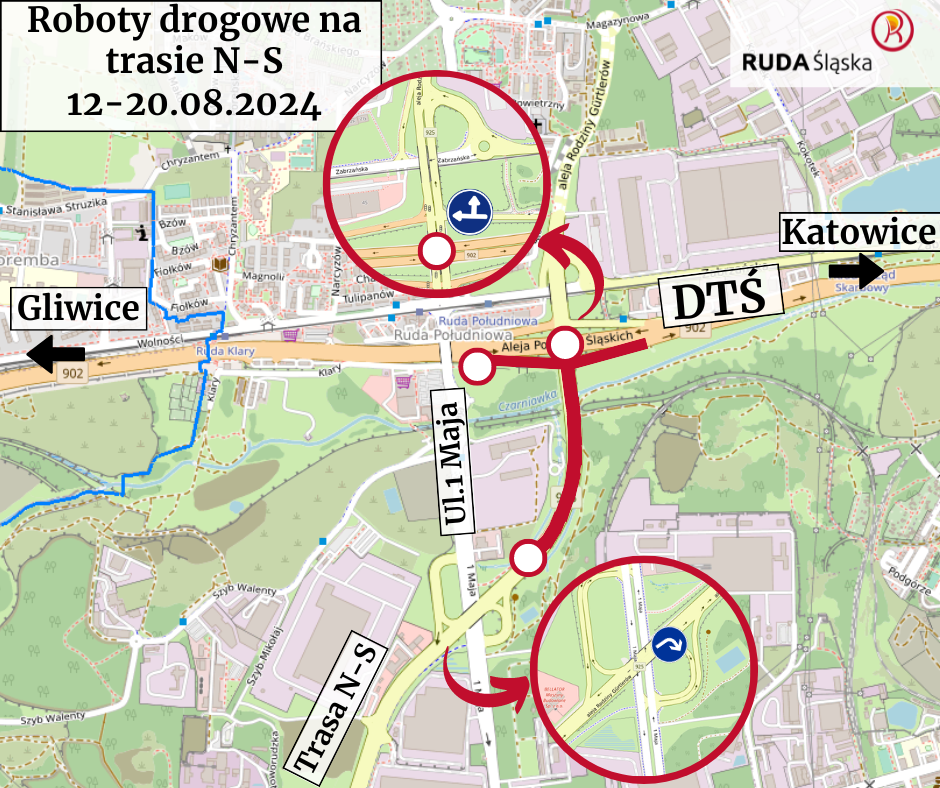 12 sierpnia rozpocznie się generalna wymiana nawierzchni na węźle trasy N-S nad Drogową Trasą Średnicową w Rudzie Śląskiej. Prowadzone będą też prace związane z synchronizacją istniejącej sygnalizacji świetlnej z tą, która powstaje w ramach rozbudowy trasy N-S w kierunku północnym. W związku z tym zamknięty dla ruchu zostanie sam węzeł oraz odcinek trasy między nim a węzłem nad ul. 1 Maja.