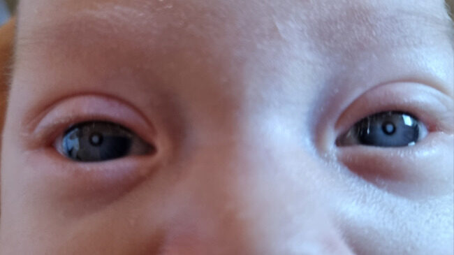 Natanek urodził się jako wcześniak, w 34. tygodniu ciąży, i od początku towarzyszyły mu trudności zdrowotne. Zaraz po urodzeniu zauważono niepokojące zmiany w jego oczach – białe plamki na źrenicach, które blokowały pole widzenia. Szybko umówiono go na wizytę w Uniwersyteckim Centrum Klinicznym w Katowicach, gdzie zdiagnozowano wrodzoną zaćmę. Plamki, które widać na zdjęciu poniżej, zasłaniały centralną część źrenicy, co uniemożliwiało prawidłowe widzenie.