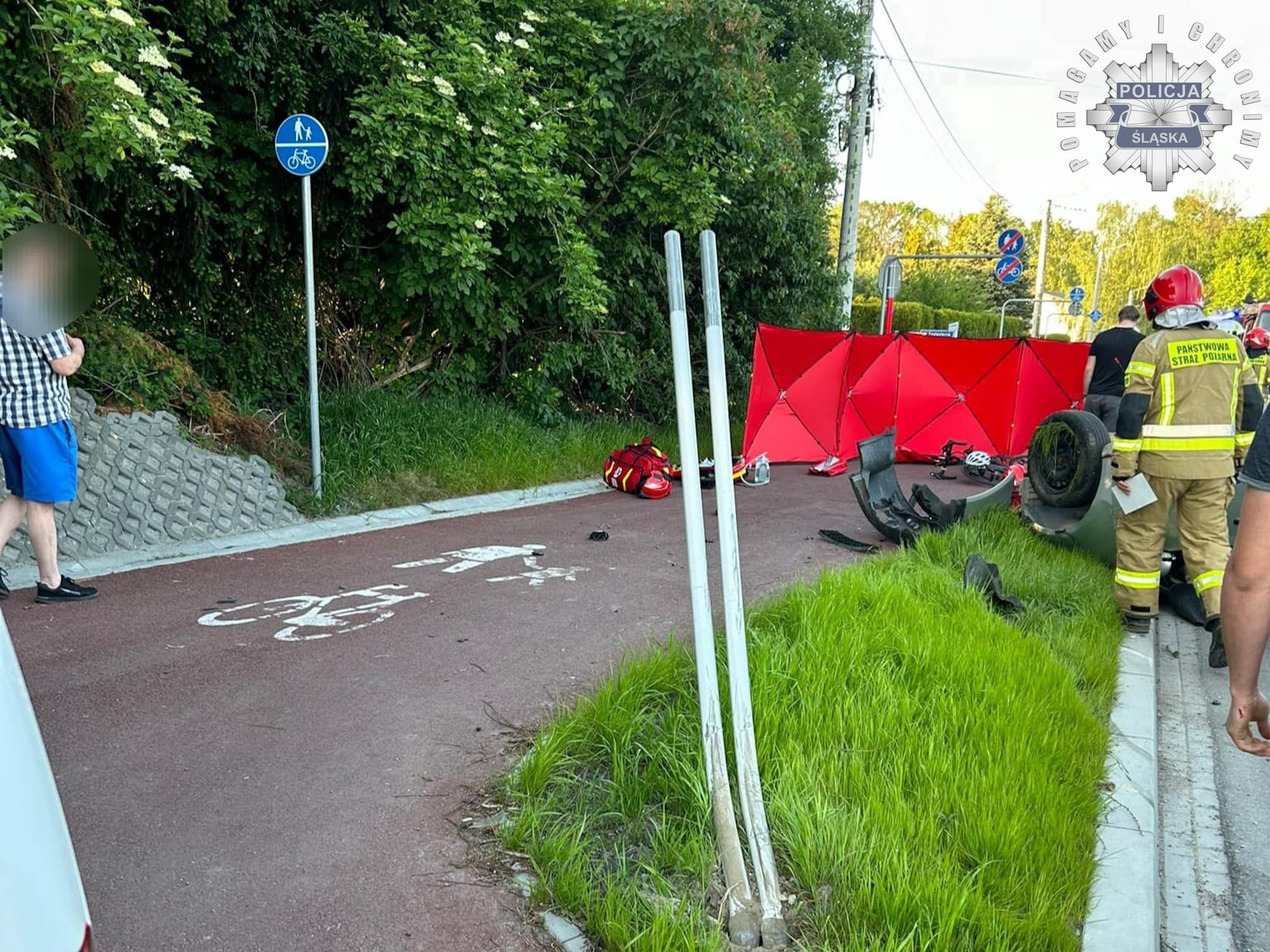 Wstępne ustalenia policjantów pracujących na miejscu wskazują, że kierujący samochodem po zderzeniu z kierującą rowerem utracił panowanie nad pojazdem i dachował.