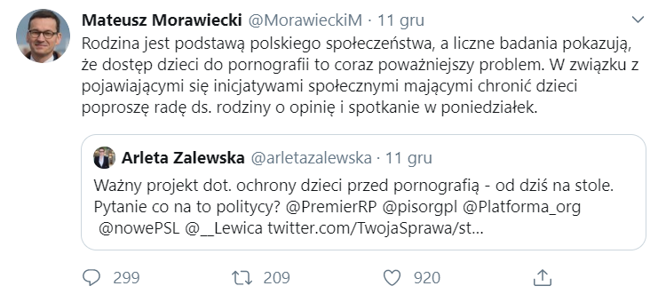 Projekt ustawy obywatelskiej dot. ochrony dzieci przed pornografią trafił do premiera w ubiegłym tygodniu. Mateusz Morawiecki obiecał, że osobiście będzie uczestniczył w dalszych pracach nad projektem. Napisał na Twitterze, że problem dostępu do pornografii w Polsce jest poważny.