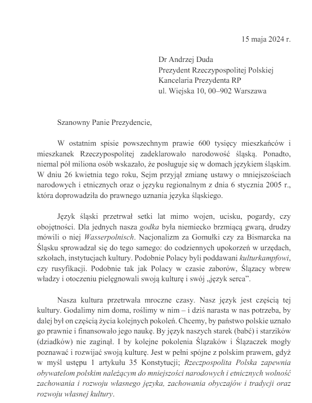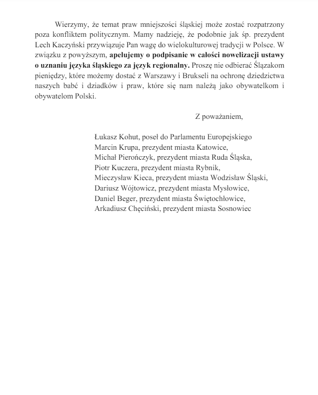 "Wierzymy, że temat praw mniejszości śląskiej może zostać rozpatrzony poza konfliktem politycznym. Mamy nadzieję, że podobnie jak śp. prezydent Lech Kaczyński przywiązuje Pan wagę do wielokulturowej tradycji w Polsce. W związku z powyższym, apelujemy o podpisanie w całości nowelizacji ustawy o uznaniu języka śląskiego za język regionalny. Proszę nie odbierać Ślązakom pieniędzy, które możemy dostać z Warszawy i Brukseli na ochronę dziedzictwa naszych babć i dziadków i praw, które się nam należą jako obywatelkom i obywatelom Polski." – czytamy w liście do głowy państwa.