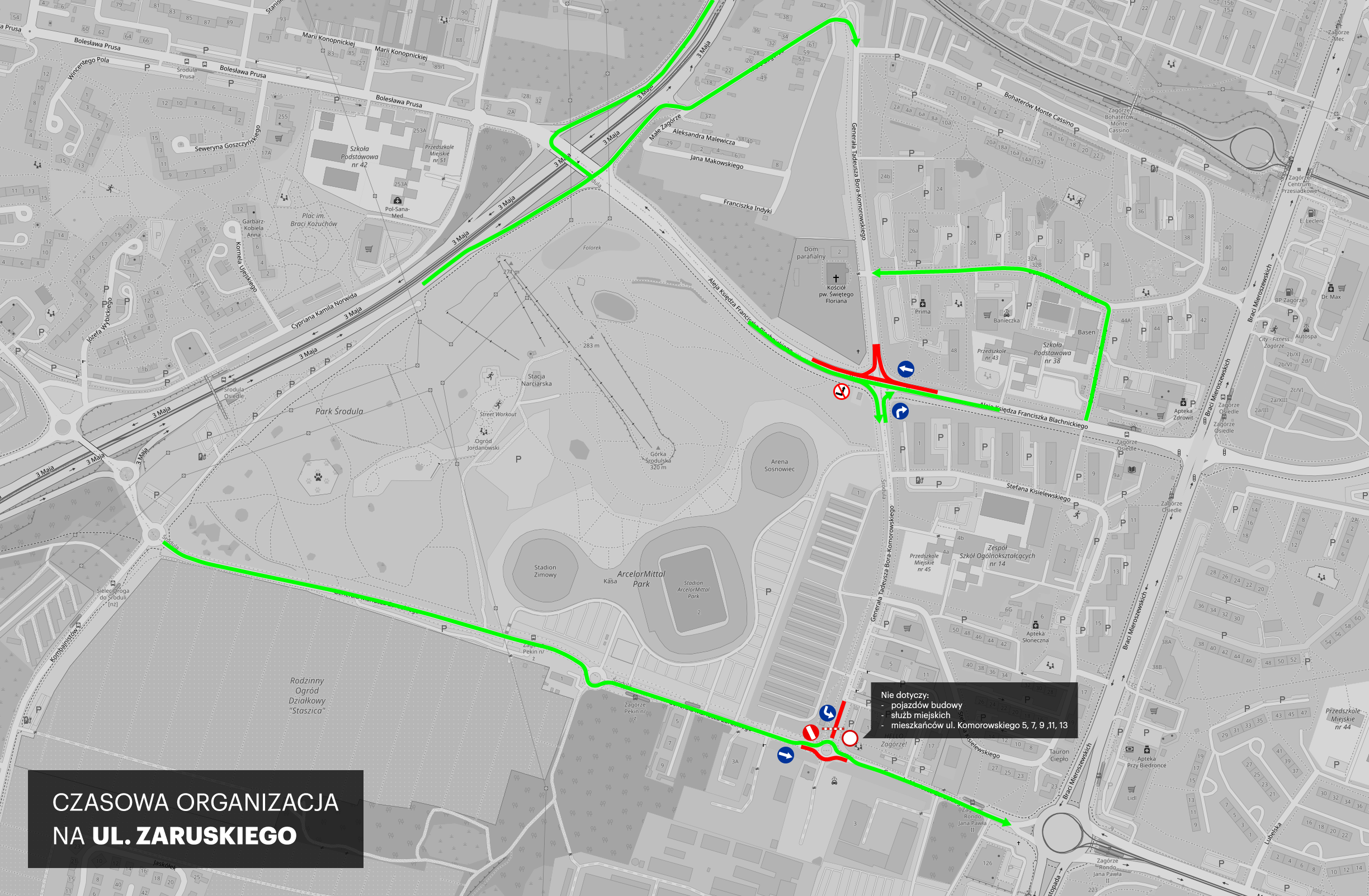 Całkowicie wyłączony z ruchu będzie wjazd w ul. Bora-Komorowskiego w kierunku kościoła św. Floriana. Objazd będzie poprowadzony przez skrzyżowanie al. Blachnickiego i Bohaterów Monte Cassino lub poprzez ul. Małe Zagórze.