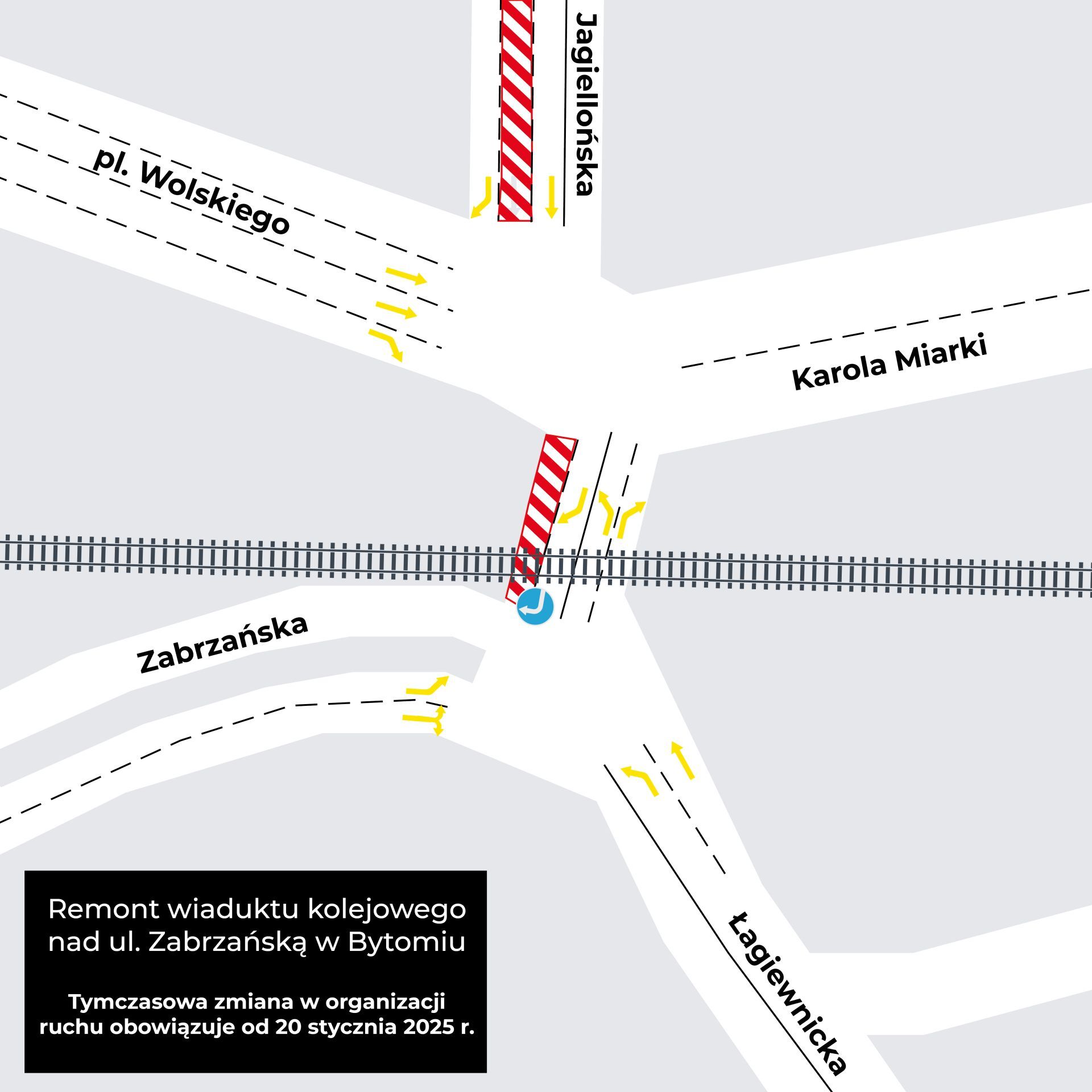 Zmiana organizacji ruchu zostanie wprowadzona na ul. Jagiellońskiej. Zamknięty zostanie jeden z pasów ruchu, a auta pojadą tylko skrajnym prawym pasem w kierunku placu Wolskiego oraz jednym pasem na wprost (po torowisku) w kierunku Szombierek.