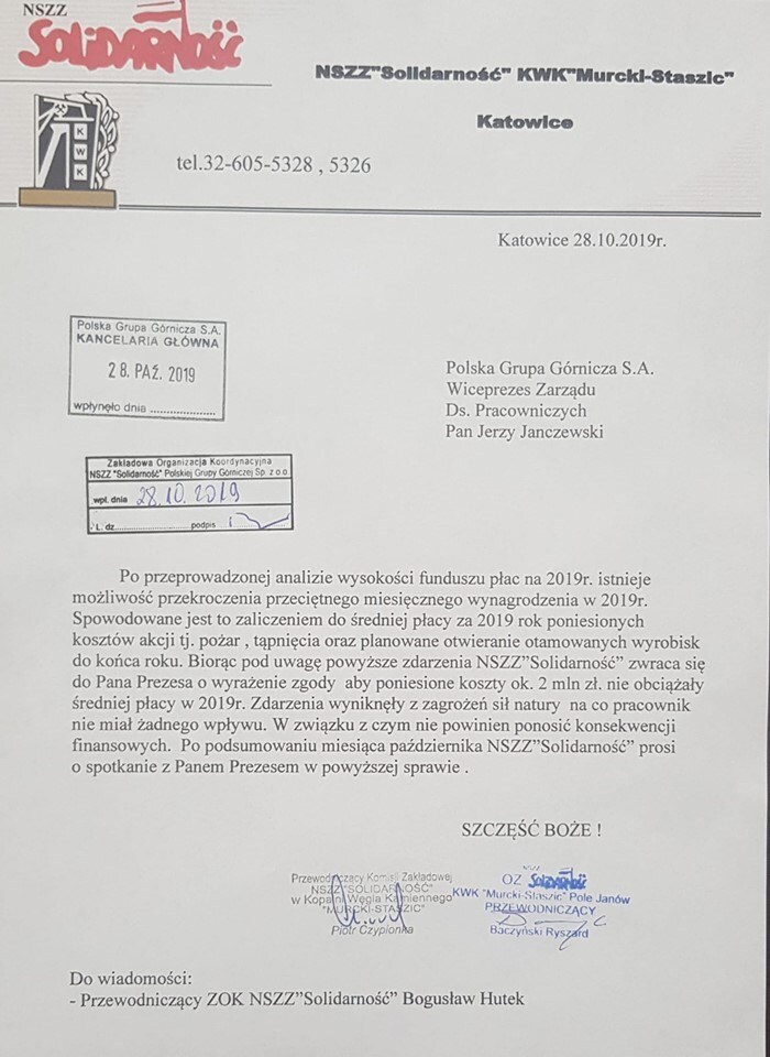 NSZZ "Solidarność" wystosowało pismo do wiceprezesa PGG ds. pracowniczych Jerzego Janczewskiego. W liście wnioskuje o to, aby koszta poniesiona za akcje ratownicze i naprawcze z powodu pożarów oraz tąpnięć nie wypłynęły na pensje górników pracujących dla Polskiej Grupy Górniczej. Według związku pożary i tąpnięcia wynikały z sił natury, na co górnicy nie mieli żadnego wpływu. Solidarność obliczyła, że koszta związane z tymi katastrofami naturalnymi wynoszą 2 miliony złotych, Związek nie chce jednak, aby ta kwota nie obciążała średniej płacy górników w 2019 roku. Dlatego prosi o spotkanie z wiceprezesem, aby wynegocjować najlepsze warunki dla pracowników.