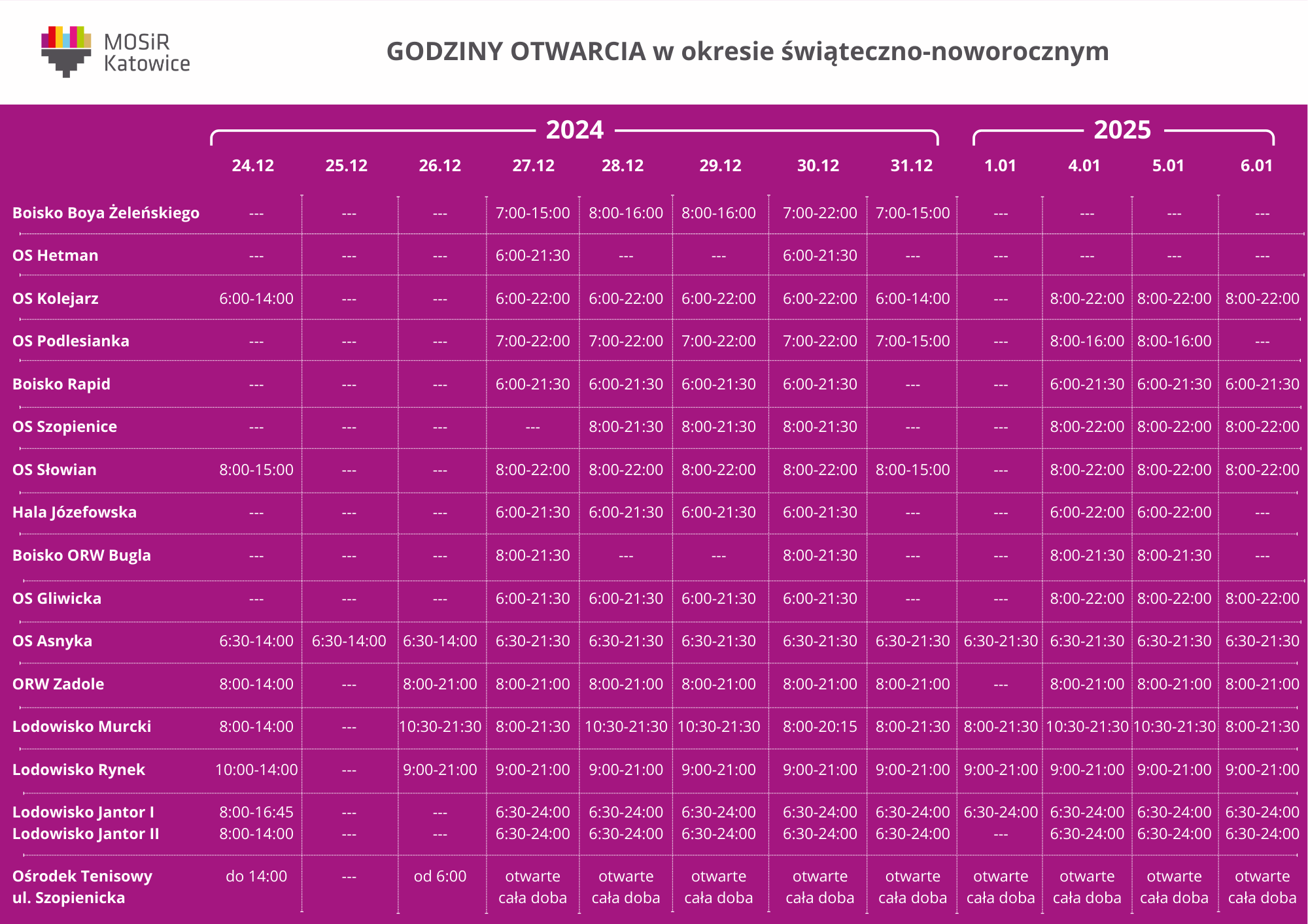 Nowy Rok i Święta Bożego Narodzenia to idealny moment, aby połączyć świąteczną atmosferę z aktywnym wypoczynkiem. Miejski Ośrodek Sportu i Rekreacji w Katowicach zadbał o to, organizując specjalne godziny otwarcia swoich obiektów, dzięki czemu mieszkańcy i goście mogą spędzić ten czas w ruchu i w wyjątkowym klimacie.