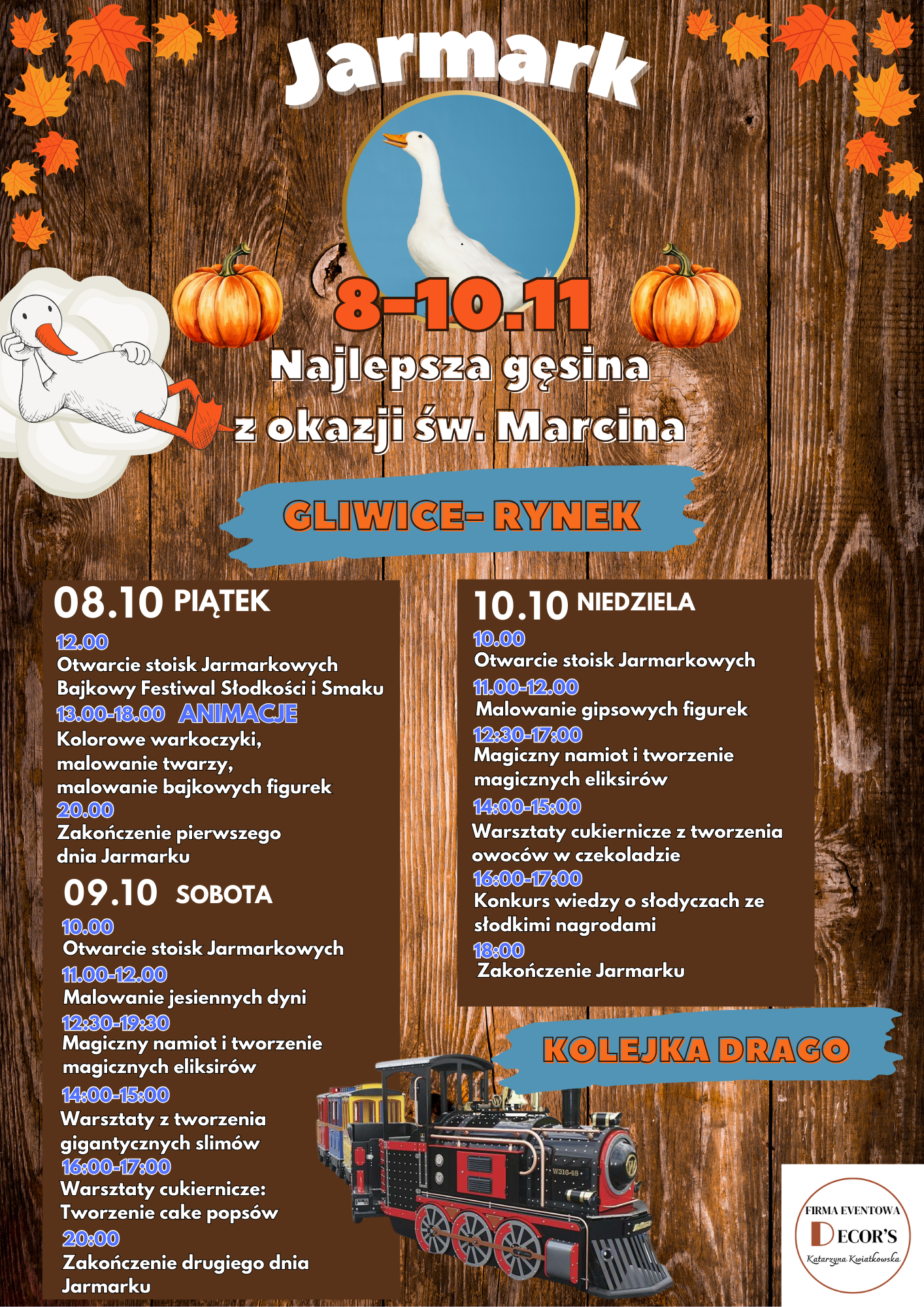 Już w ten weekend gliwicki Rynek zamieni się w pełen życia Jarmark św. Marcina. Od 8 do 10 listopada czekają na Was liczne atrakcje: stoiska z unikalnym rękodziełem, smakowite przekąski, tradycyjne potrawy i słodkości, a wszystko to przy dźwiękach muzyki na żywo. Przygotujcie się na niezapomnianą atmosferę w samym sercu Gliwic!