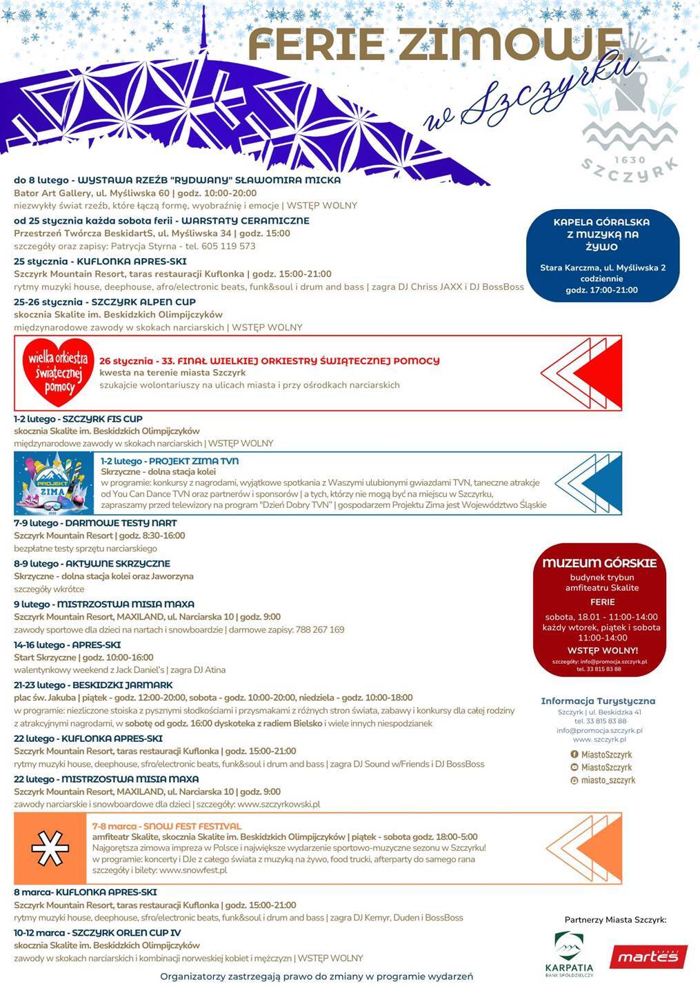 W programie m.in. zawody w skokach narciarskich na skoczni Skalite, Projekt Zima TVN w Skrzyczne - ośrodek narciarski, warsztaty w Przestrzeni Twórczej BeskidartS, wystawa rzeźby w Bator Art Gallery, codzienna muzyka góralska na żywo w restauracji Stara Karczma, zawody narciarskie dla dzieci w strefie Maxiland i apres-ski w restauracji Kuflonka w Szczyrk Mountain Resort, Beskidzki Jarmark na placu św. Jakuba czy największe wydarzenie muzyczno-sportowe, czyli SnowFest Festival 2025, które będzie zwieńczeniem tegorocznej zimy w Szczyrku!