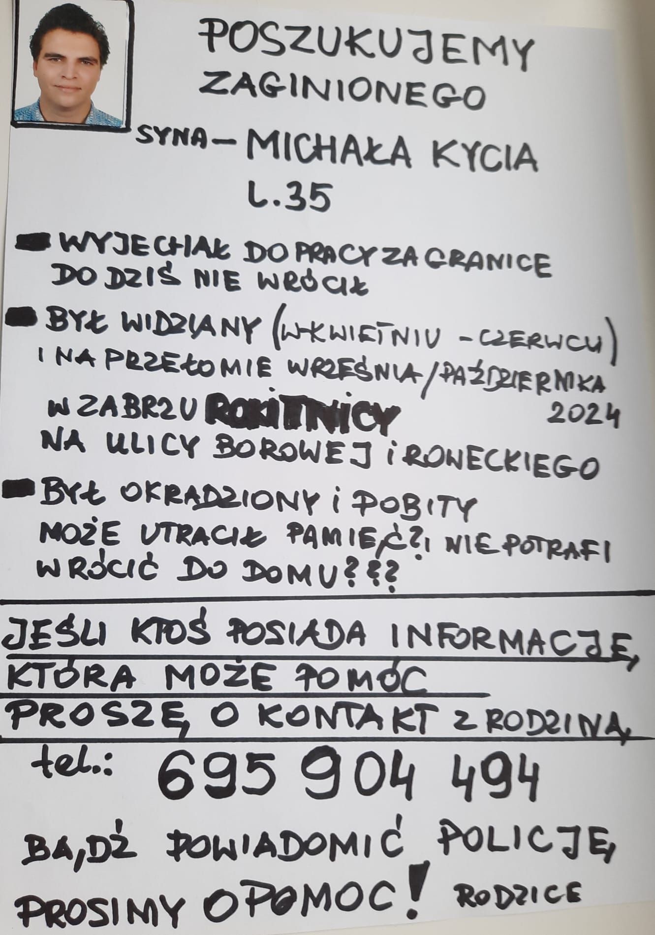 Od kilku miesięcy nie ma żadnego kontaktu z 35-letnim Michałem Kyciem, który ostatnio przebywał w Niemczech. Mężczyzna miał wrócić do rodzinnego Zabrza, jednak ślad po nim zaginął. Policja prowadzi poszukiwania i apeluje do wszystkich, którzy mogą mieć jakiekolwiek informacje na jego temat.