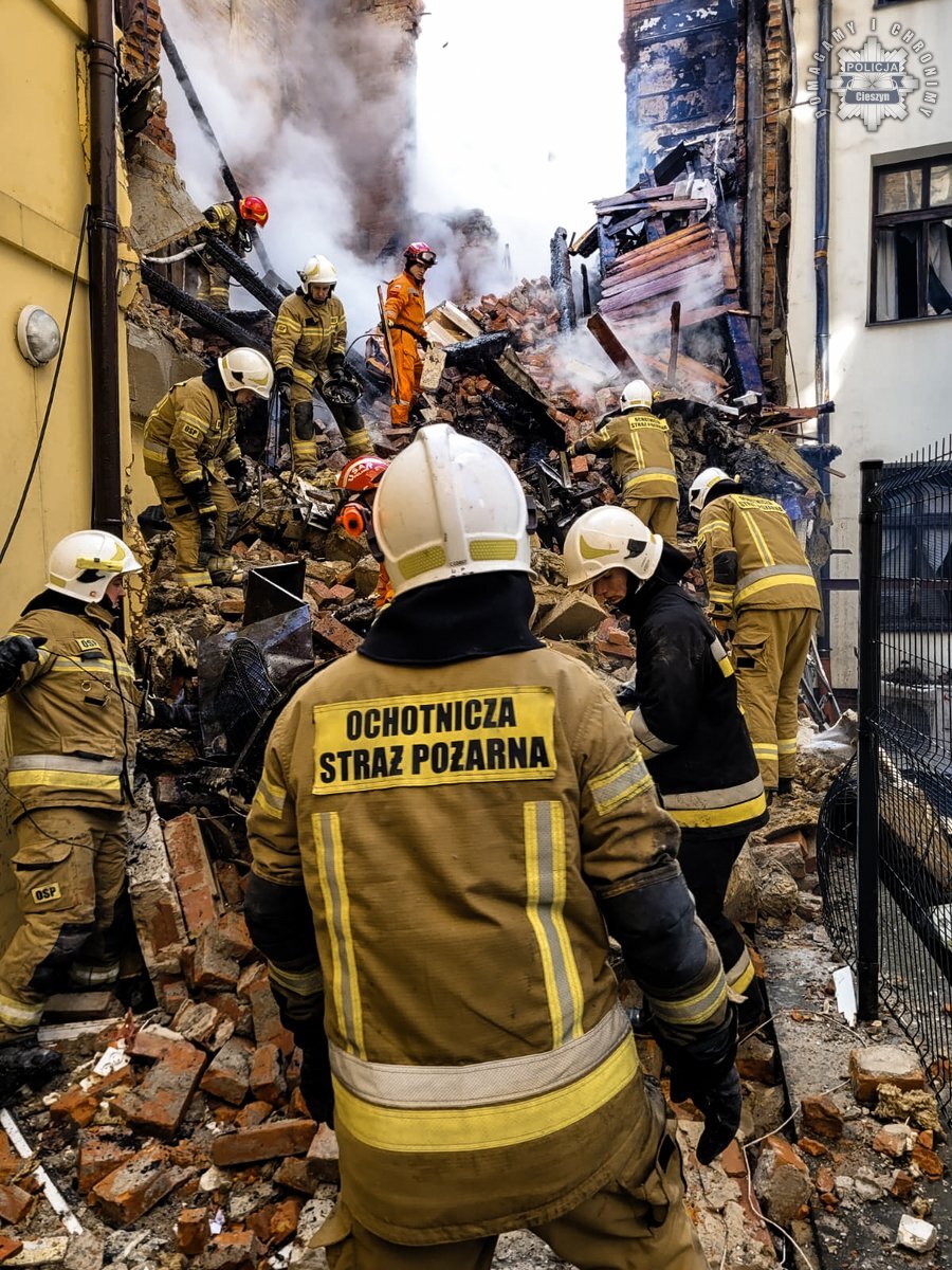 Działania blisko 200 strażaków, którzy prowadzili czynności ratownicze w miejscu zawalenia kamienicy, wspierała grupa blisko 100 policjantów, w tym specjalistów z Zespołu do Spraw Katastrof Wydziału Kryminalnego Komendy Wojewódzkiej Policji w Katowicach, kryminalnych i z pionu prewencji cieszyńskiej komendy oraz mundurowych z katowickiego oddziału prewencji - relacjonuje policja.