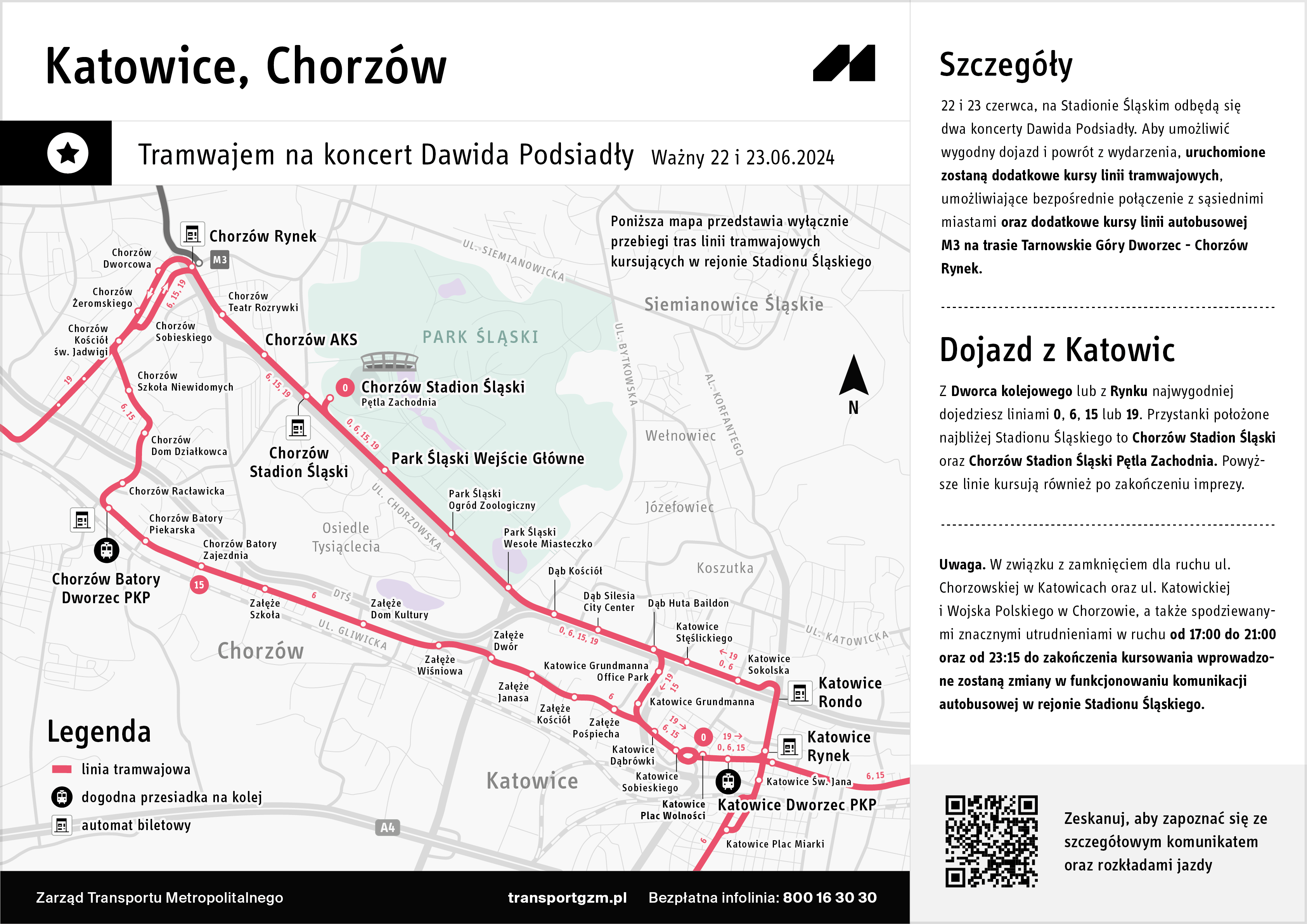 Zarząd Transportu Metropolitalnego przewiduje dodatkowe kursy tramwajów. Szczegółowy zakres zmian w organizacji transportu zbiorowego w związku z wydarzeniami na Stadionie Śląskim w tych dniach, jest dostępny na stronie internetowej Zarządu Transportu Metropolitalnego.