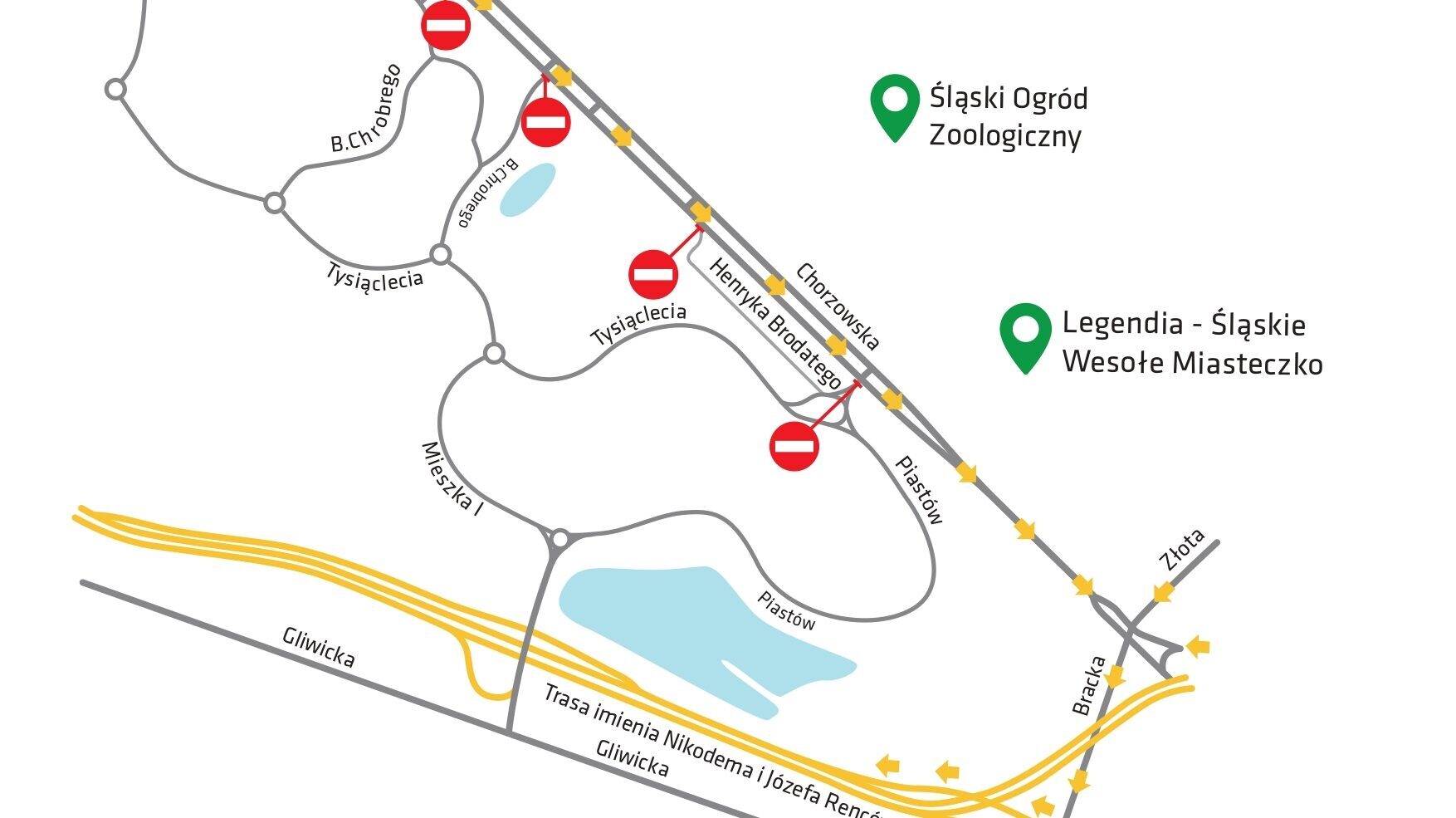 Ponadto 22 i 23 czerwca, wzdłuż ul. Chorzowskiej - na odcinku od ul. Złotej do granicy z Chorzowem, zostaną wprowadzone dodatkowe zakazy zatrzymywania i postoju. Analogiczne oznakowanie zostanie wprowadzone na ul. Brackiej od Drogowej Trasy Średnicowej do ul. Chorzowskiej.